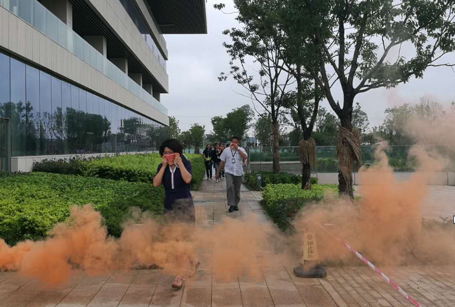 與此同時,在警鈴響起的第一時間,總部各部門義務消防安全員迅速組織本部門員工按照指定的疏散路線疏散。在逃生通道樓道口,疏散組為逃生人員準備了小毛巾,旁邊放置了水桶,方便沾濕毛巾捂住口鼻,防止煙霧進入呼吸道。在疏散出口,由疏散組人員引領,全體人員由不同路徑集中至大樓門前指定的安全地帶。