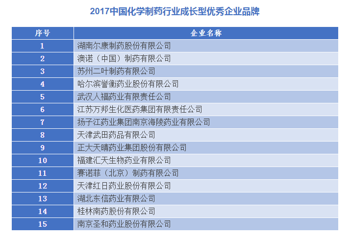 榜單包括“2017中國醫(yī)藥行業(yè)企業(yè)集團十強”、“2017中國化學(xué)制藥行業(yè)工業(yè)企業(yè)綜合實力百強”、“2017中國化學(xué)制藥行業(yè)創(chuàng)新型優(yōu)秀企業(yè)品牌”、“2017中國化學(xué)制藥行業(yè)成長型優(yōu)秀企業(yè)品牌”、“2017中國化學(xué)制藥行業(yè)制劑出口型優(yōu)秀企業(yè)品牌”等多個代表性排名數(shù)據(jù)。