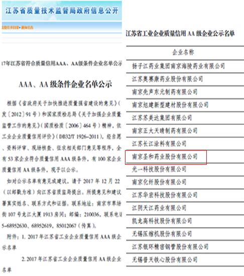 本網(wǎng)訊 2017年12月15日,江蘇省質(zhì)量技術(shù)監(jiān)督局公示了2017年度江蘇省AA級(jí)質(zhì)量信用企業(yè)名單,南京圣和藥業(yè)股份有限公司榜上有名。