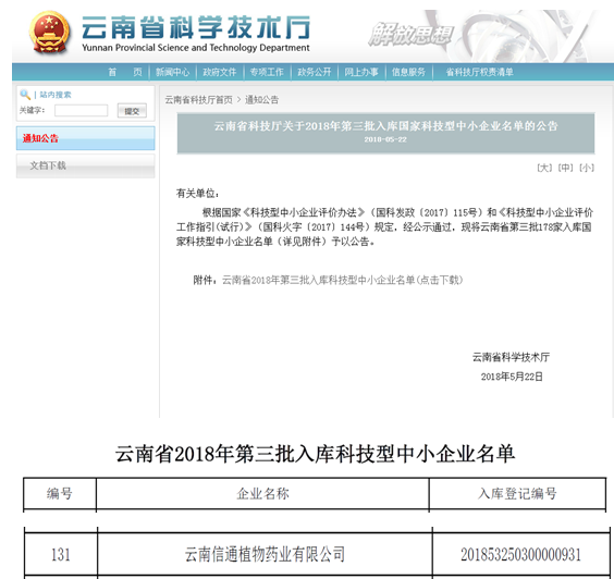 本網(wǎng)訊 云南信通植物藥業(yè)有限公司繼2015年獲云南省科技廳認(rèn)定的“中藥現(xiàn)代化科技產(chǎn)業(yè)(云南)基地中藥材種植科技示范園”和“云南省農(nóng)業(yè)科技示范園”后, 2017年4月獲云南省科技廳認(rèn)定為“云南省科技型中小企業(yè)”,2018年5月成功入庫并成為“國家科技型中小企業(yè)”。