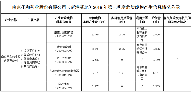 南京圣和藥業(yè)股份有限公司(新港基地)2018年第三季度危險廢物產(chǎn)生信息情況公示