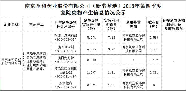 南京圣和藥業(yè)股份有限公司(新港基地)2018年第四季度 危險(xiǎn)廢物產(chǎn)生信息情況公示