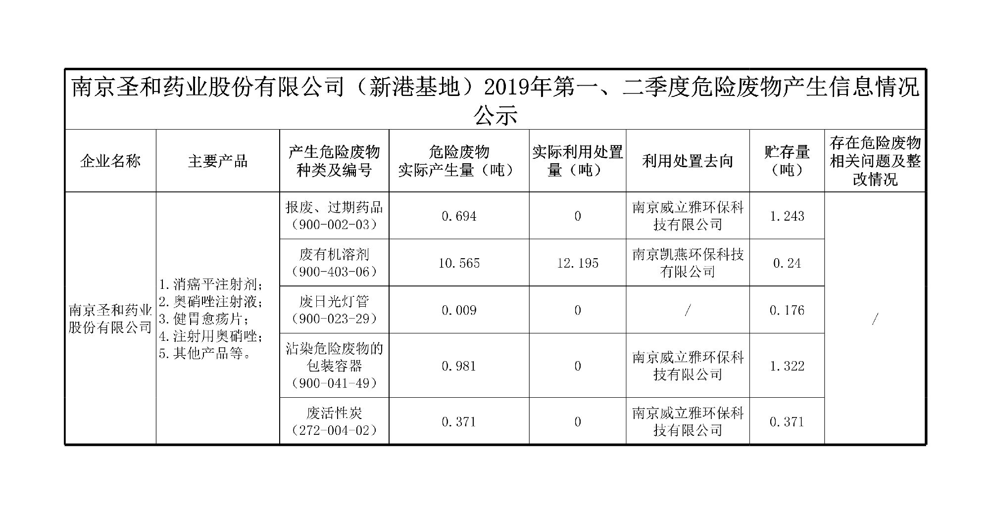 南京圣和藥業(yè)股份有限公司(新港基地)2019年第一、二季度危險廢物產(chǎn)生信息情況公示