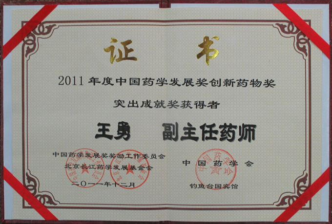 本網(wǎng)訊 2011年度中國藥學(xué)發(fā)展獎頒獎大會12月18日在北京釣魚臺國賓館隆重舉行,我公司王勇董事長喜獲“2011年度中國藥學(xué)發(fā)展獎創(chuàng)新藥物獎突出成就獎”,全國人大常委會副委員長桑國衛(wèi)出席大會,并向王勇董事長頒獎。