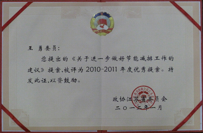 為鼓勵(lì)先進(jìn),不斷增強(qiáng)政協(xié)履行職能的實(shí)效,日前,經(jīng)省政協(xié)十四屆四十六次主席會(huì)議審議,政協(xié)江蘇省委員會(huì)表彰出72件優(yōu)秀提案和25篇優(yōu)秀視察調(diào)研報(bào)告。王勇董事長(zhǎng)作為省政協(xié)委員,提出的《關(guān)于進(jìn)一步做好節(jié)能減排工作的建議》提案,被表彰為2010-2011年度優(yōu)秀提案。