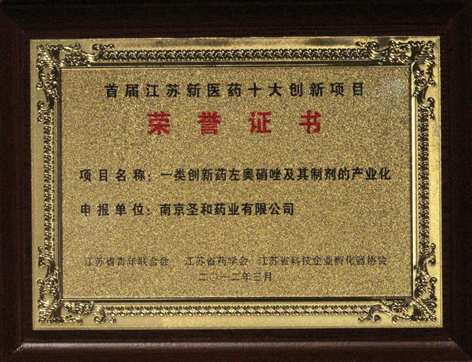 為了深入實(shí)施科教興省和人才強(qiáng)省戰(zhàn)略,促進(jìn)新醫(yī)藥等六大新興產(chǎn)業(yè)的發(fā)展,發(fā)現(xiàn)和凝聚一批青年創(chuàng)新創(chuàng)業(yè)領(lǐng)軍人才,江蘇省青年聯(lián)合會(huì)、江蘇省藥學(xué)會(huì)、江蘇省科技企業(yè)孵化器協(xié)會(huì)聯(lián)合在全省范圍內(nèi)開(kāi)展了首屆江蘇新醫(yī)藥科技創(chuàng)新創(chuàng)業(yè)項(xiàng)目大賽暨青年科技領(lǐng)軍人才舉薦活動(dòng)。目前,我司申報(bào)的“一類創(chuàng)新藥左奧硝唑及其制劑的產(chǎn)業(yè)化”項(xiàng)目,被授予“首屆江蘇新醫(yī)藥十大創(chuàng)新項(xiàng)目”榮譽(yù)稱號(hào)。